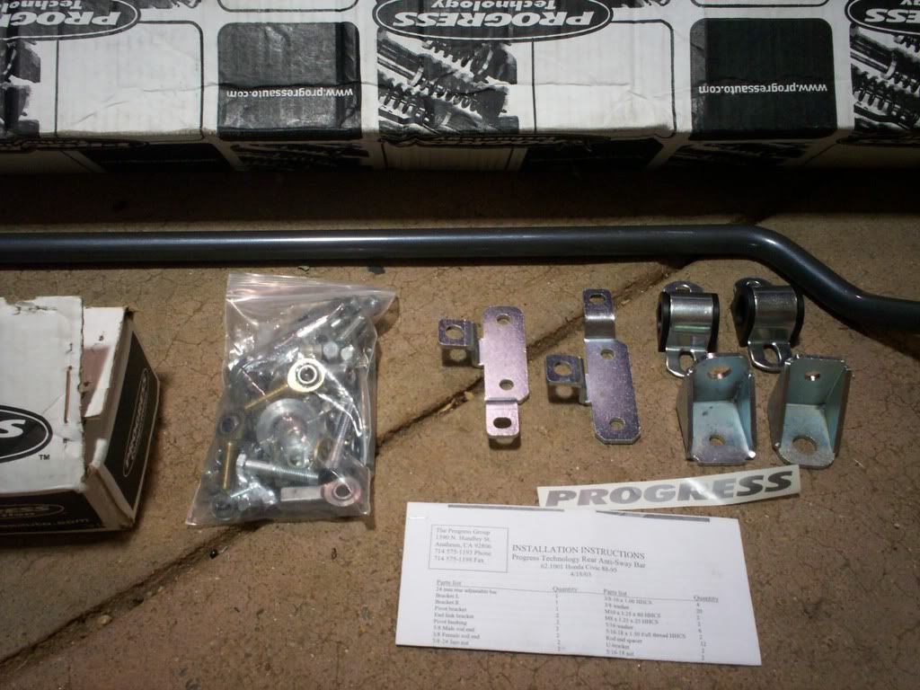 My Progress Technologies 24mm fully adjustable swaybar for a DC integra or EG civic. It comes with adjustable spherical endlinks, polyurethane D link bushings, and every single nut and bolt you will need to install this.