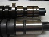Both cams align'd by the alignment rings. And you can see the difference between the snots. Even tho my cam has press on cam lobes, you can see how their snot is further in than factory.