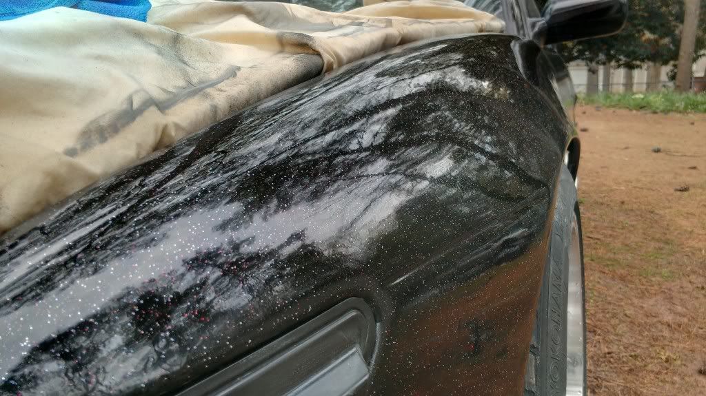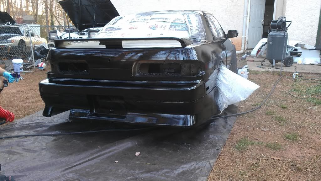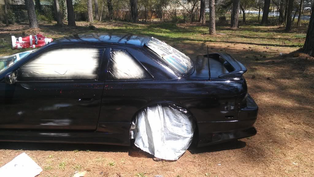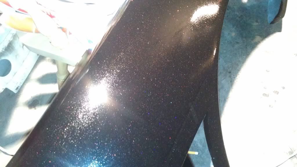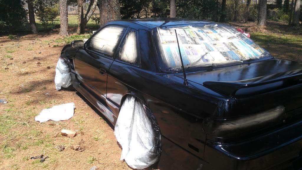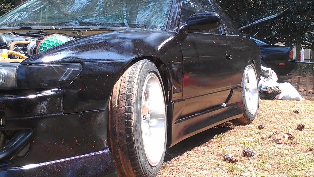 Yeah. I mean in spots its pretty bad and rough but all in all it came out smooth. Only had one or two runs (psi was wrong). After we bumped it up from 20 to 60 it started to look better. Ill save my money up and get a better paint job later, but for now I just wanted it to be all one color. Has a lot of flake in the paint. Its also a stage 1 type paint. Looks better then a rattle can job. Still haved to wet sand the fiber glass fenders and front bump. My trunk is fucked due to some asshole sanding groves into it so its either sand it to bare metal or get a new trunk...I'm going with new trunk. Ill post more pics after I get the low pro tires on and front bumper. Still waiting on my inner and outers along with my gktech offset spacers. Still have some more work but its a working progress.
