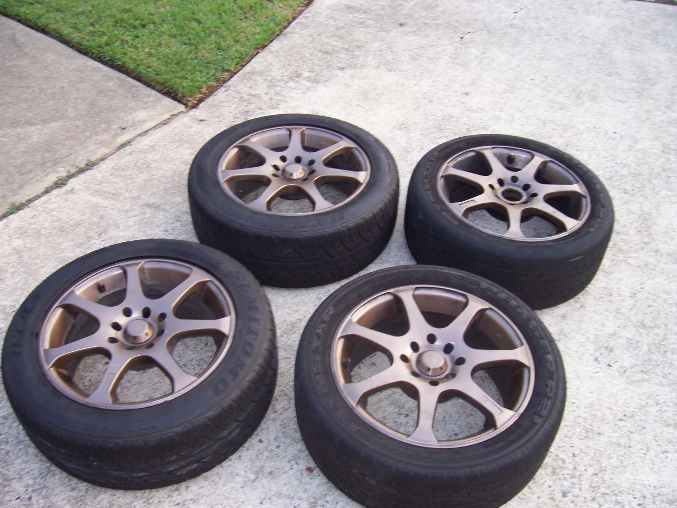 Hey yall I got an extra set of wheels that I need to get out of my garage. They are a bronze set of Motegi 7spokes that are in used but good shape with normal little knicks here and there and about 50% tread left on them. I need to get $400obo out of them so let me hear some offers. Possible to trade, but only for Rota Slips, GT-3 in red, or J-Mags. If you got crap keep it to yourself.