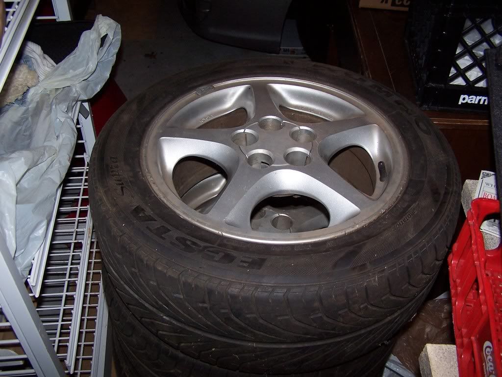 These came off a Toyota Celica lug pattern is 5x100. Kumhos have plenty of tread left of them (90%), tire size is 205/55/15. No major damage...good condition- $200.