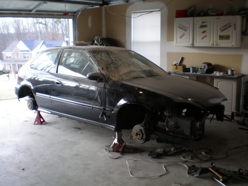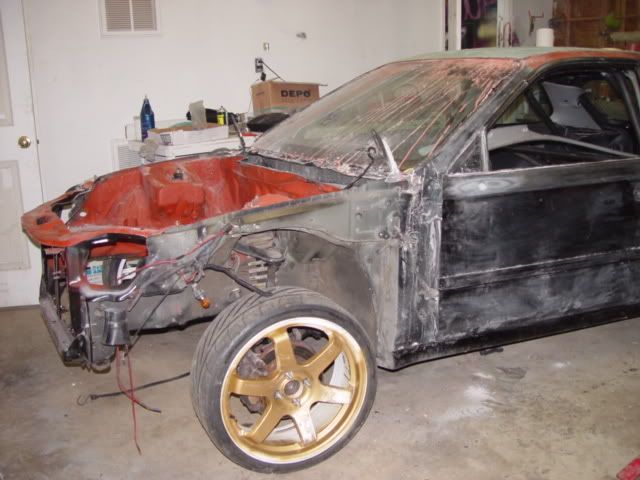 Well here is the pic of the car when i was ging to drop it off at the body shop.If you notice the whole engine bay is shaved now.The only holes you see are ones i need...