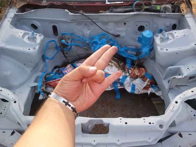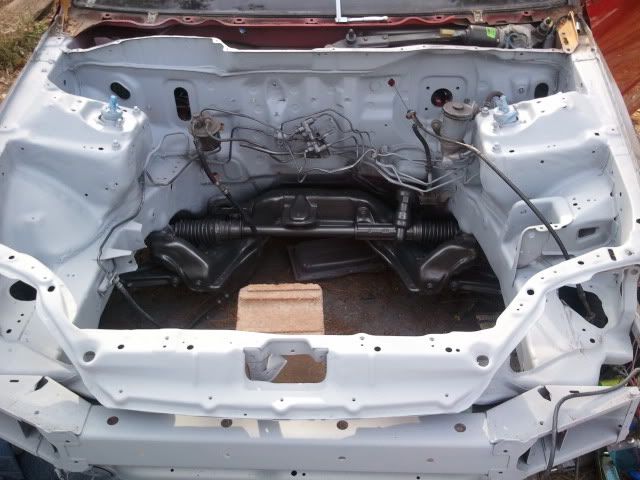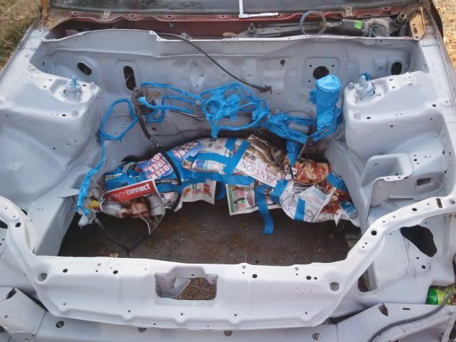 bay finally sanded. primed and ready for paint. painted subframe. taped up line for paint