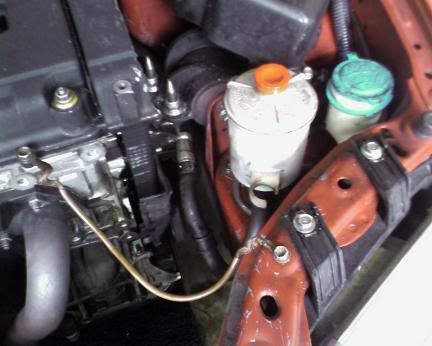With Kori's help last night I was able to rig my power steering so that the line would no longer be in the way.