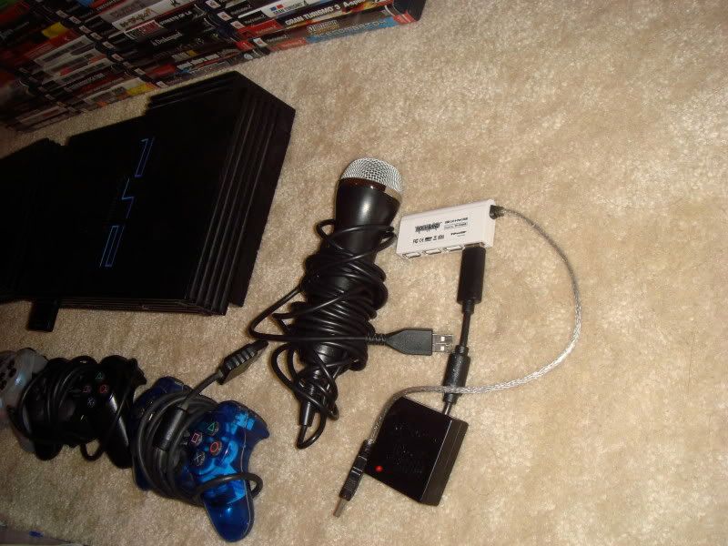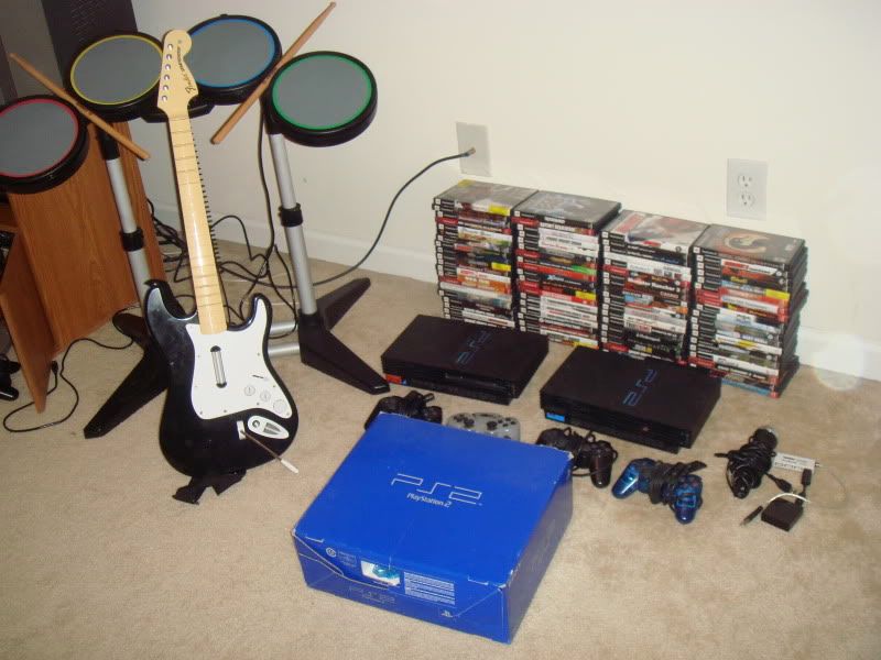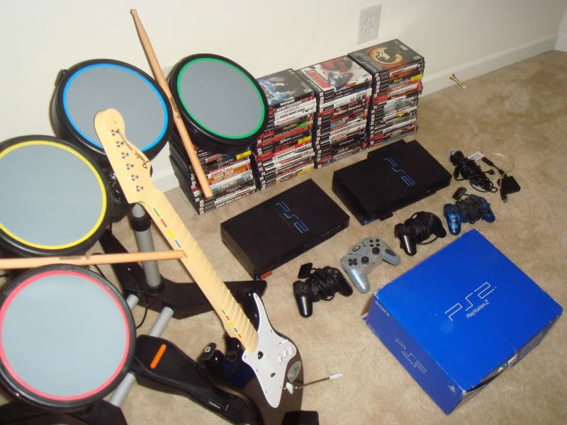 ok im putting out 2 ps2, one of them has the usb adapter on the back so you can play online. 77 games. 3 sony controllers and 1 wireless, 1 memory card, rockband kit; drum kit, drum stick, drum pedal, guitar, mic, and usb adapter. games list: