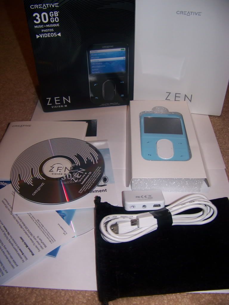 I am selling a Creative Zen Vision M. It's basically brand new with the protective plastic thing still on the screen. its been powered on a couple of times but never really used. It is still under the manufacturers warranty as well. This item comes complete with the box and all the manuals. the only thing that its missing is the headphones. if i find them around the house i'll let yall know. im looking to get about 210 for it. here are some pics.