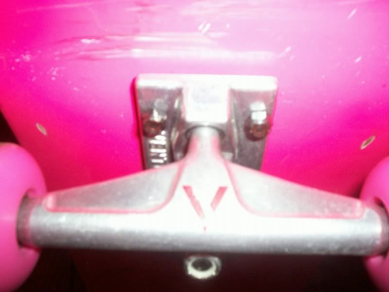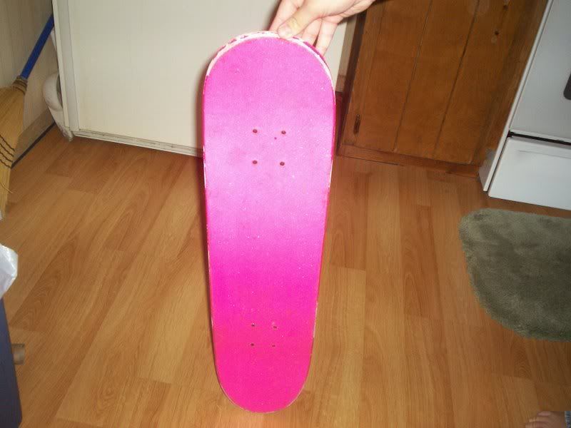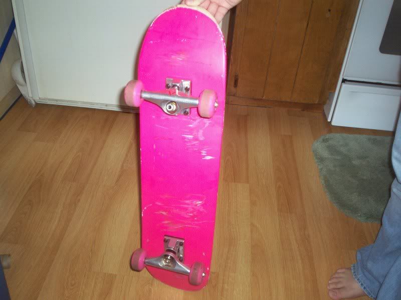 Ok I have a ALL hot pink skateboard everything is hot pink except the Trucks that are Ventures that are silver with a red V on them. This deck cost me 92$ to make. I purchased all the parts of off www.blankskateshop.com ( didn't buy the trucks from them. I bought them from BC at the MoG) I bought all the parts at placed 6/14/2007 at 11:11PM. Yes there are scratches on it and all well wtf do you expect? I never beat on the board this has maybe 3 days worth of skating and each day is maybe 2 hrs of skating. So a totoal of 6hrs of use. These deck was going to be my transportation for when I go to Cali during the summer. But Delta was a ****ing ***** and wouldn't let me take it with me.