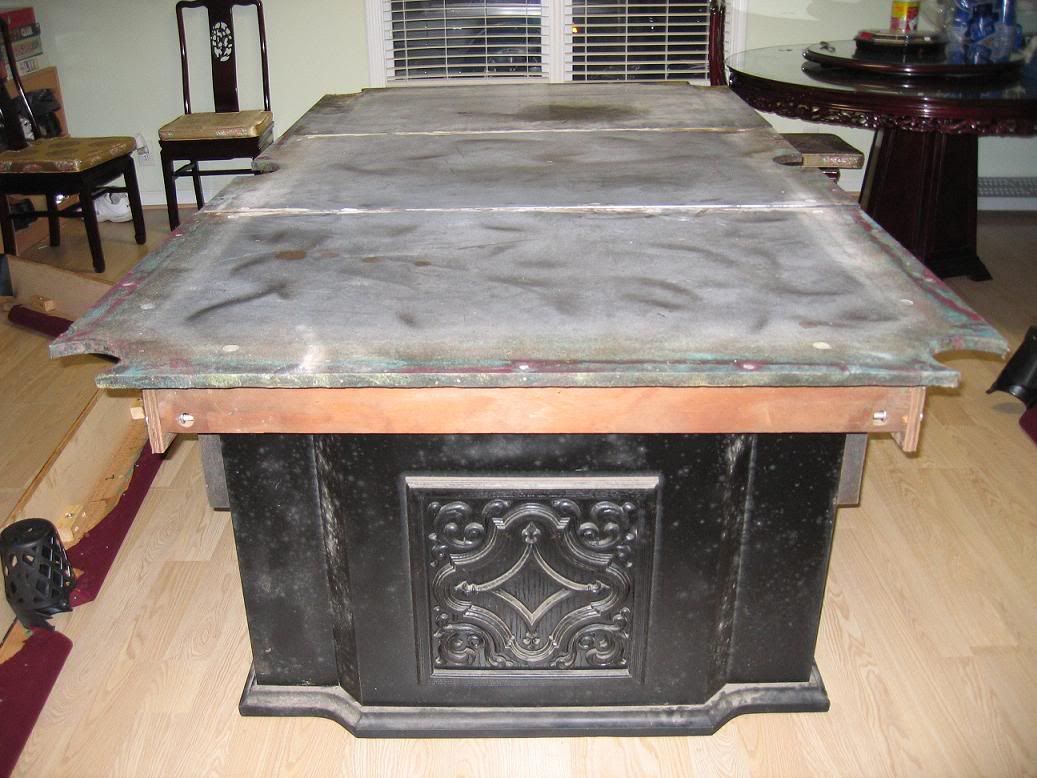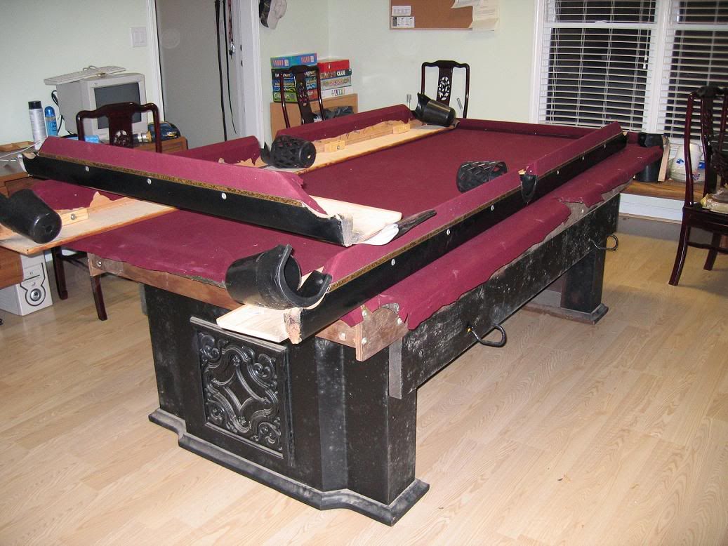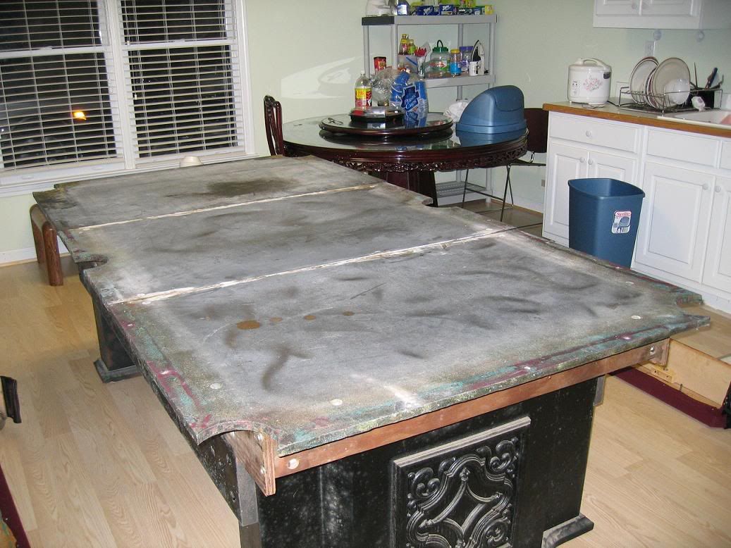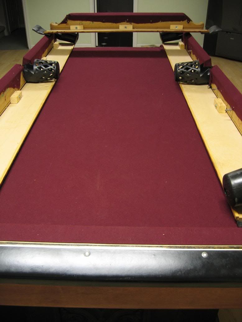 the table has 3 separate slate tops covered by a burgundy felt cloth.