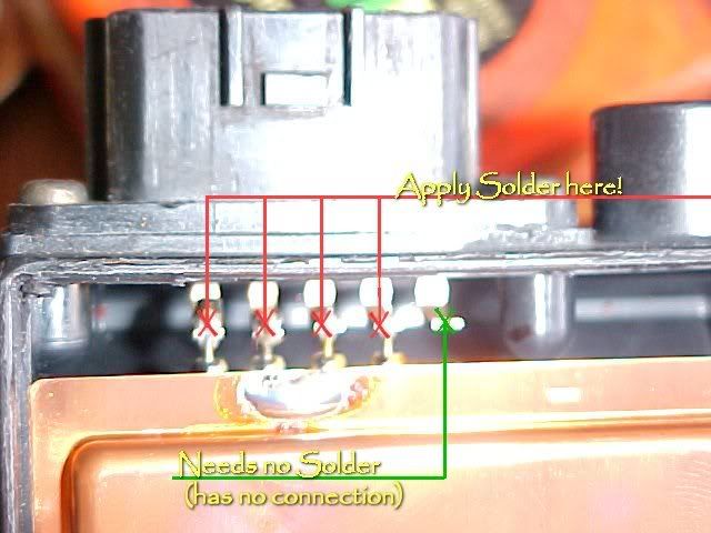 inside you will find this: this is where the soldering comes into play, put some solder in the areas I have marked. Don't worry about old solder, mine just burnt off anyway. I am not sure what the 5th connector is for, as it has no internal connections and therefor needs no solder, it wasnt from the factory apparently so yeah.