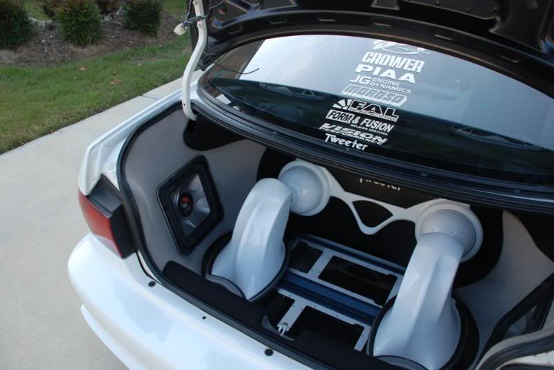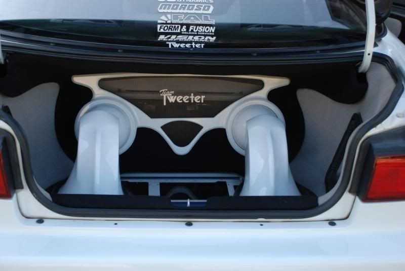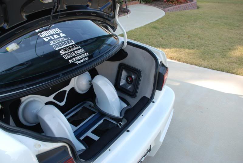 Custom trunk enclosure built by HIFI buys covered with sparco fabric to match interior