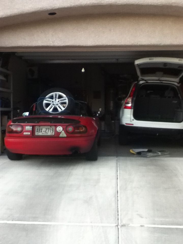 While I was off at the store my mom made a run to the Starbucks, that is literally .28 miles from her house. Got a nail, tire went flat after she pulled back in the garage. Never fear, the Miata in here.