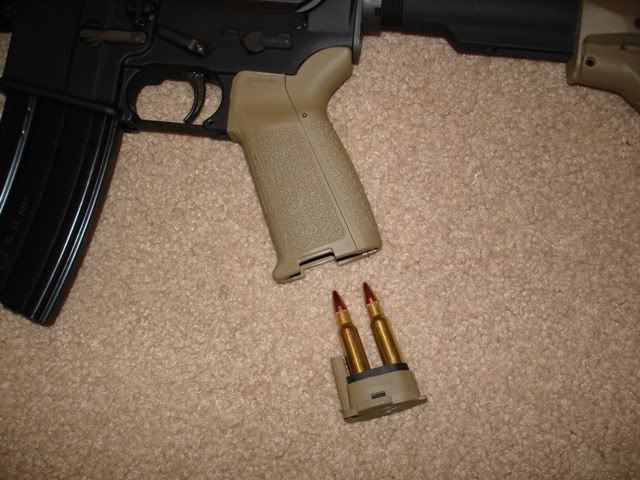 I bought this gun a few weeks ago and it finally got here today. I wanted a 6.8 spc, but everyone has been sold out for a while, so I had to improvise. The gun started as a $900 Rock River LAR15 flat top 5.56mm. From there I had a $550 PRI 6.8 SPC Barrel and bolt installed. I also had a $400 Daniel Defense rail, $40 Daniel Defense rail panels, $140 Magpul CTR stock, and $80 magpul MAID grip installed. The grip is pretty cool, you can hide two rounds inside it. I also bought a scope mount and today I installed an extra scope I had already. I plan on getting a NCSTAR tactical scope sometime soon, as well as a magpul trigger guard.