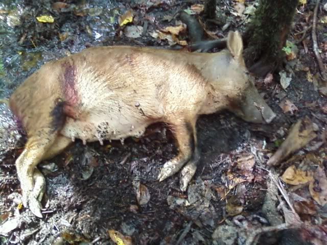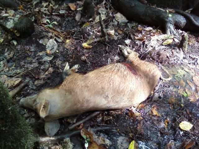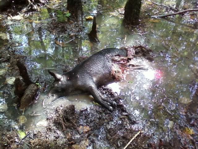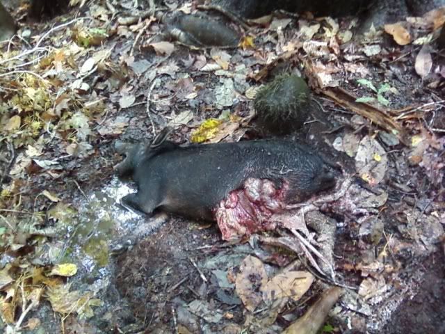So I went back hunting again today. Pics are still from crappy cell phone. One shot kill on both. I guess thats what a .338 Win Mag does to a hog. Anywho.. The sow was about 160lbs and the smaller one was about 60. We did a quick field dressing and got about 75 lbs of meat. Anywho...