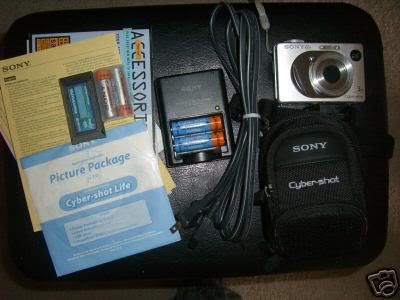 Here I got up for sell is a used Sony Cyber-Shot 5.1 megapixel camera. It is in really good condition, was not used alot. It has jsut beening sitting on table for a long time. I checked the camera and it works fine. There are no scracthes on the lens nor the screen of the camera. The model of this camera is DSC-W1. A bunch of accessories also comes with this camera. First, it comes with two pair of sony rechargable batteries w/ one battery case, a sony camera case, two memory sticks ( one 32mb and one 256mb with a case, a battery charger to recharge your batteries, and also the manual book and the cd and other papers that came with the camera is included. Everything posted in the picture is what you get.