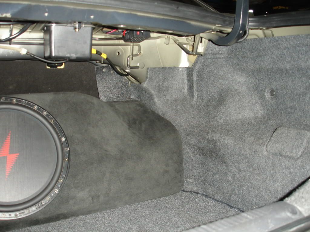 Maybe this would have been a better starting point to display what we are capable of and what a customer should expect to see from us. None the less this enclosure has been seen before but maybe not on here. Very light weight (16lbs not incl. sub) fiberglass enclosure, covered in suede. Amp is mounted behind the enclosure on the seat back.