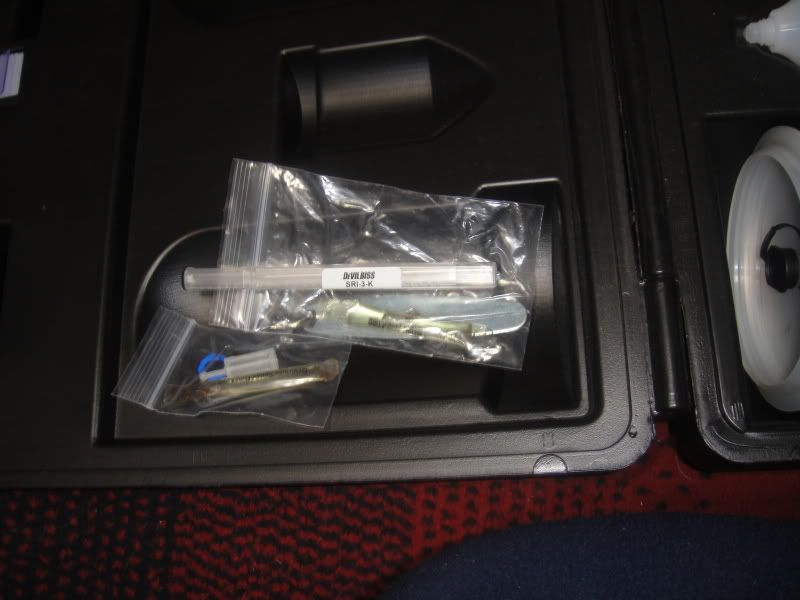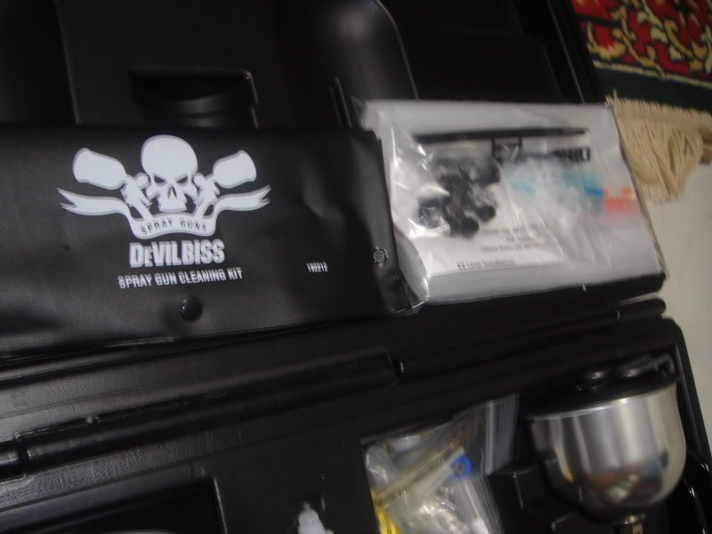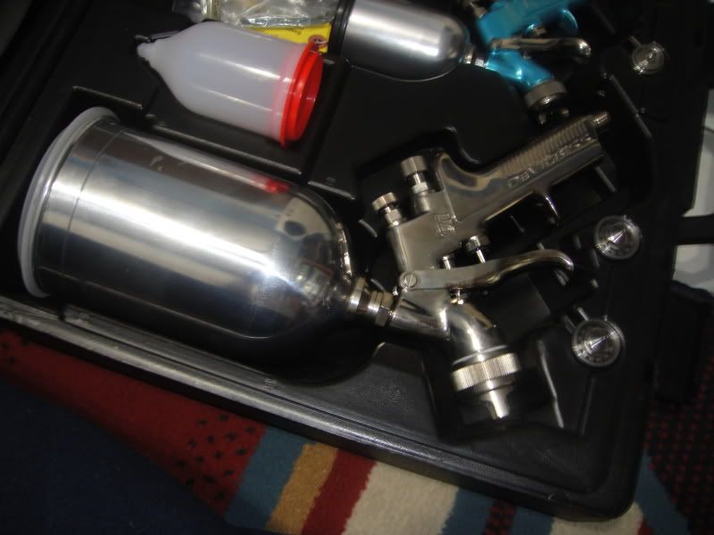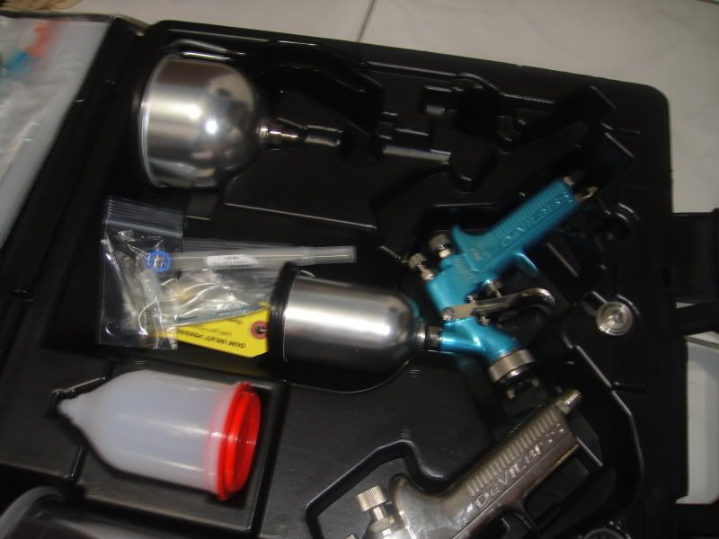 Devilbliss 620G and Devilbliss SRi Guns with 5 nozzle tips,multiple cups so that you can use the right amount of paint for the right job, cleaning kit, high acrylic primer, medium reducer, clearcoat, mid-temp activator, ingersoll rand sander, 800 grit wet/dry sandpaper 50 sheets, 80 grit sanding discs roll of 100,320 grit sanding discs roll of 100,180 grit sanding discs roll of 100, 3 sanding sticks, Metallic Dark-Grey Paint, along with mixing cups, strainers, mixing sticks, a new 3M respirator.