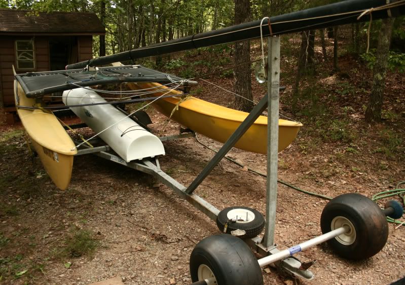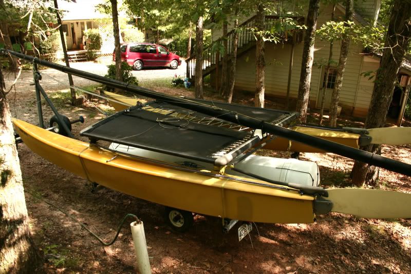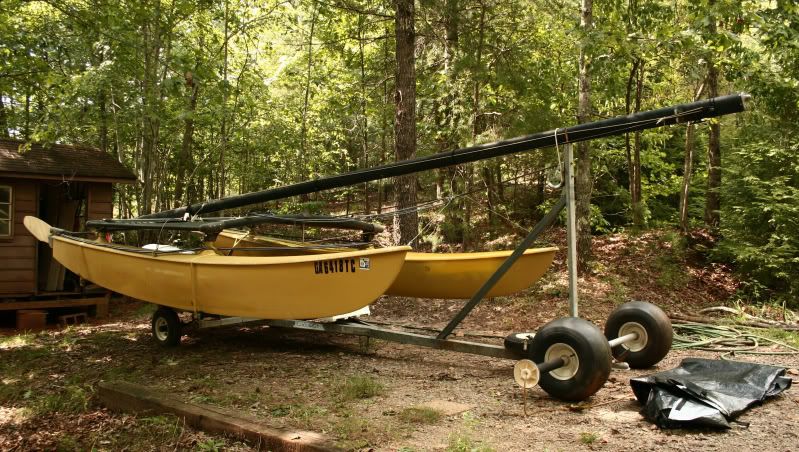 In decent shape and can be sailed today. The left hull was repaired by the PO, but still has small crack where deck meets hull(repairable). Crack only leaks a small amount after a full day of sailing. Right rudder was repaired after a tree limb broke it while it was on the trailer. Repair has been sailed on multiple times since. Tramp and sails are in good condition. Sails and Jib are multicolored(rainbow). Trailer is in ok shape, wiring is good and all lights work. Has good tires incl. spare and has grease gun bearings.