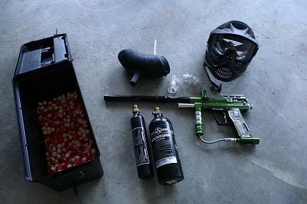 Spider Imagine Paintball with electronic trigger(1 shot,4 shot burst, and fully automatic) gun with accesories. Mask w/ goggles, 2 Co2 tanks, Half box of paintballs with tackle box, hopper, and 1 grenade. I have the remote air that allows you to mount the Co2 on your back with the belt that carries extra paintballs. I cant find it at the moment. Everything works beautifully. A very accurate, reliable, and fast gun. $ Make offer