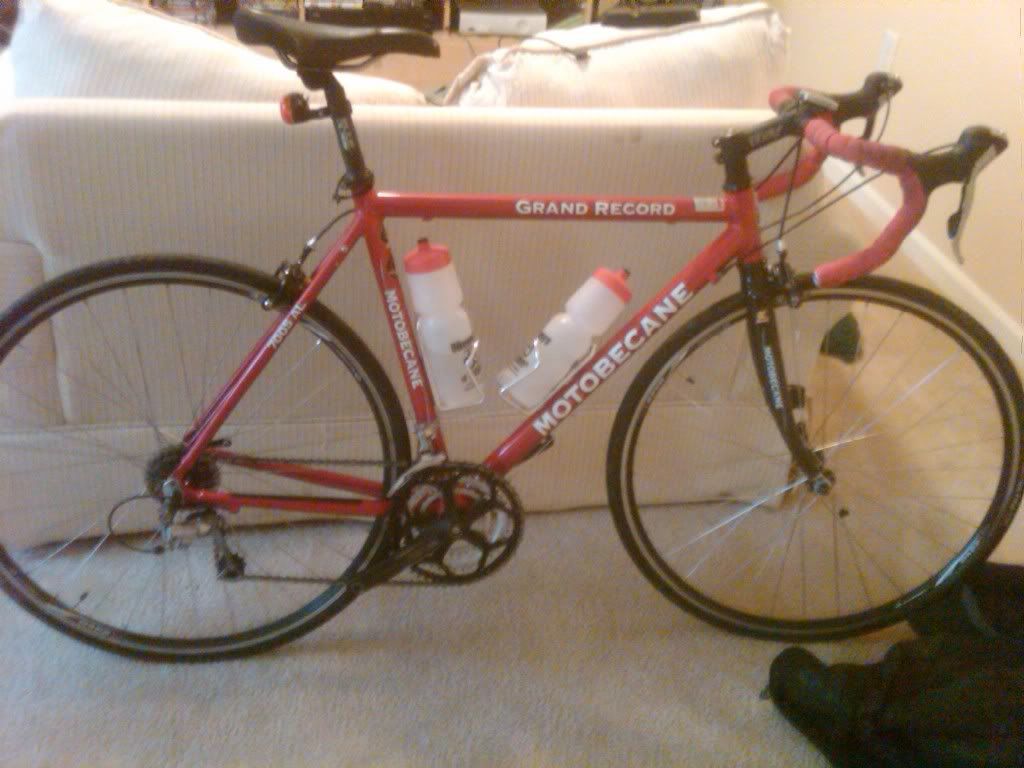 It's a Motobecane Grand record 54cm (09 it think). I got this last summer from a friend on here. Since school started I barely have time to ride my mountain bike much less this so I guess its time for it to go. I will have pictures of it first of the week. Tires are in decent shape. Rides great and shift great. I just rewrapped the bars just before winter. It has about 1500 miles on it. 400obo.
